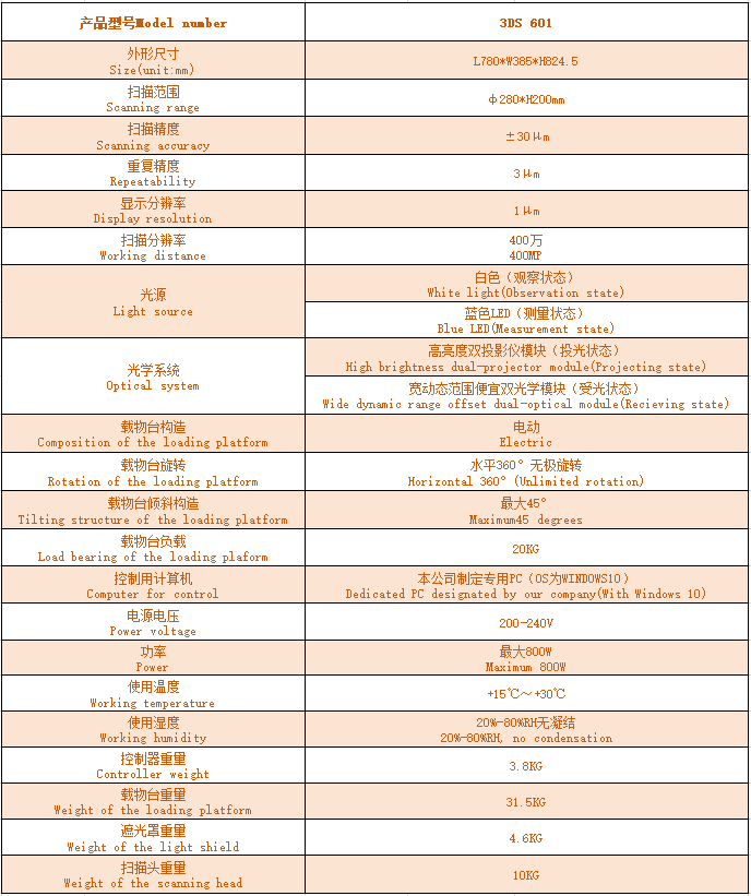 1.Blue structured light plus a loading platform which can rotate horizontally 360°and tilt up to 45°, no blind area.
