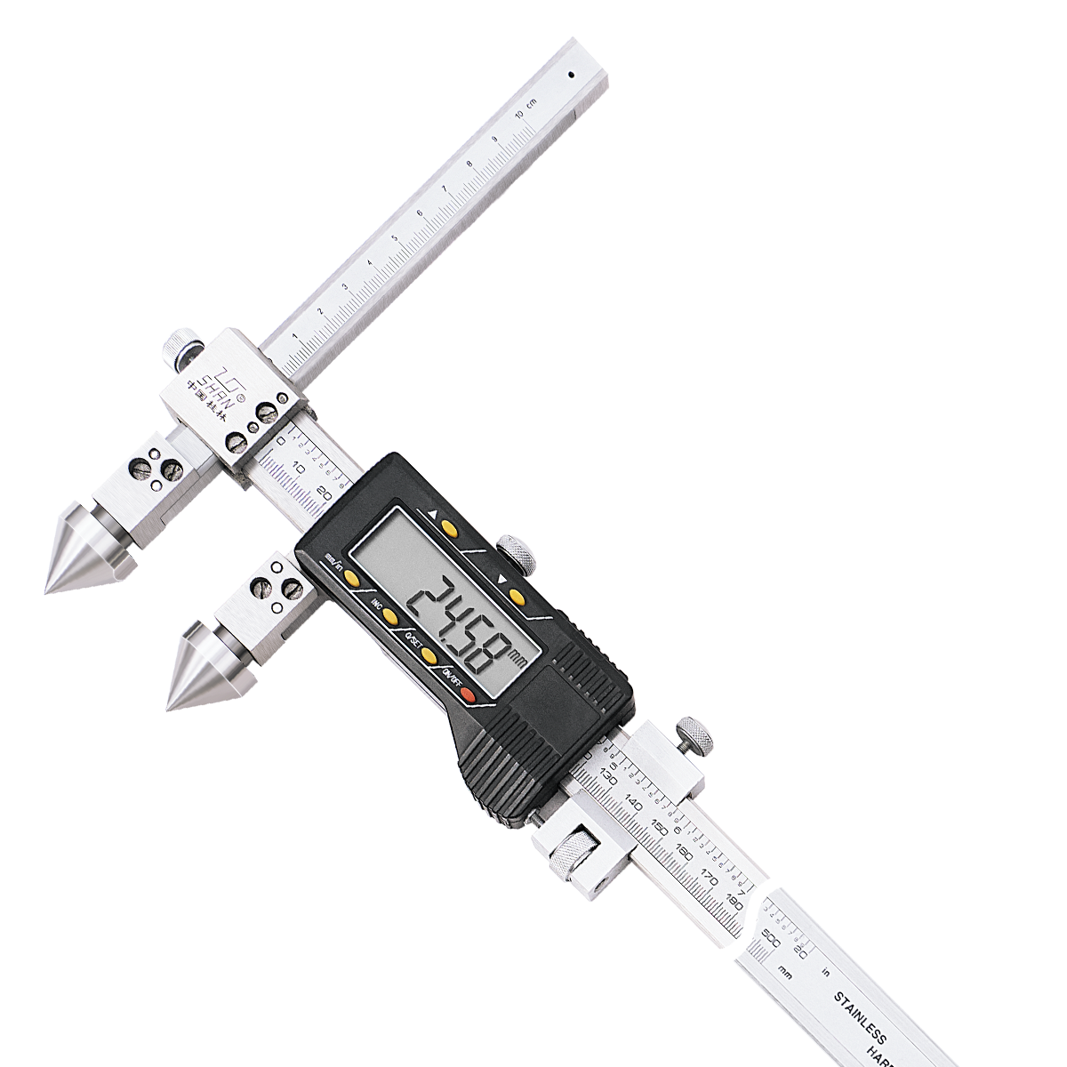 1.任意位置清零和公英制轉換 Zero setting and mm/inch conversion at any position. 2.帶數據輸出口 With data output interface. 3.主要特點同161系列孔距游標卡尺,但是液晶顯示屏,讀數方便 Design features identical to 161 series,but LCD display for easy reading.