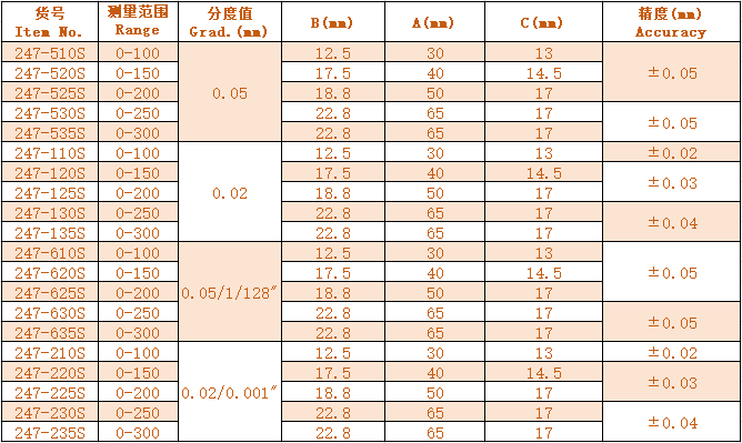 1.量面鑲裝硬質(zhì)合金,更具耐磨性 With carbide measuring faces,more wearable. 2.200mm以上規(guī)格可帶微動(dòng)滾輪 With thumb roller for range 200mm or more. 3.可進(jìn)行外尺寸、內(nèi)尺寸、深度尺寸及臺(tái)階尺寸測量 Can measure OD,ID,depth and step.