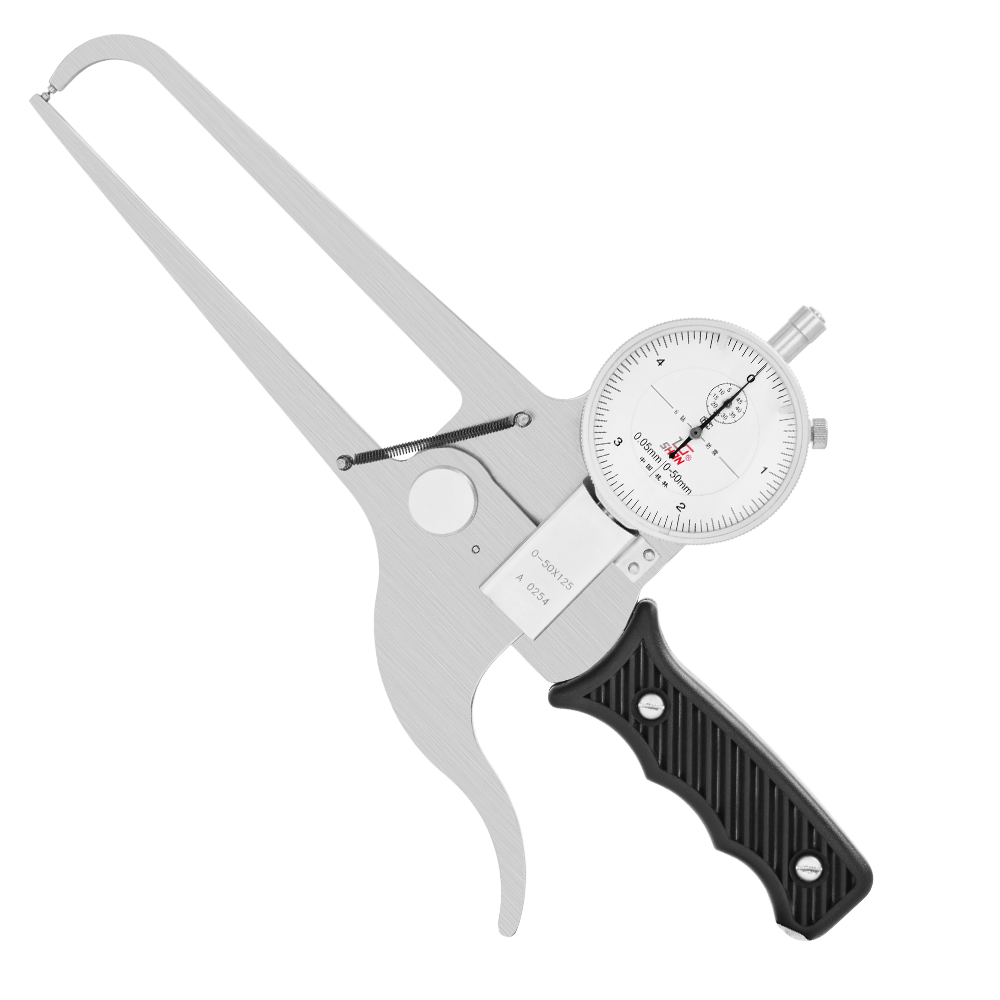 1.可進(jìn)行板料厚度、溝槽深度測量 Easy to measure diameter of steel sheet and the depth of an outside groove. 2.標(biāo)配帶鉆防震百分表 Equipped with a shock-proof dial indicator.